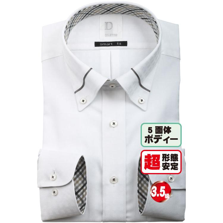 長袖ワイシャツ メンズ ドレスシャツ 超形態安定 綿100 衿切り替えし ボタンダウン ホワイト ドビー小柄 スリムスタイル 5面体ボディ Shuto シュッと プレゼント